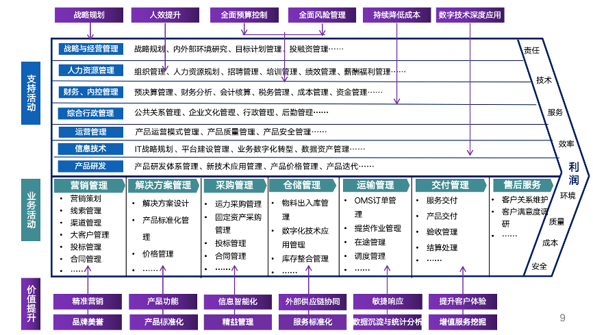 企业价值链梳理是管理体系建设的重要依据,通过将企业创造价值的活动拆分,识别并强化能够为企业带来竞争优势的战略活动,建立企业核心能力,以此来规划企业管理体系的总框架。