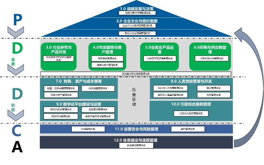 该企业管理体系梳理思路以“PDCA循环”理论为依据,建立了体系层面的动态持续提升机制。其中,战略与文化为引领,属于规划层;目标计划预算活动为衔接;业务活动与支持类活动为执行层,风控与审计职能模块为监督检查层,体系建设与流程管理为改善提升层。体系建设规划以支撑企业经营管理为目标,以持续提升改善为要求。