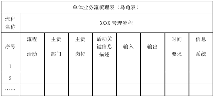 企业每一个经营基本活动的业务流,都至少包含以下几大要素信息:流程的价值/目标、责任部门及岗位、输入的信息/文件、关键信息输入部门及岗位、输出的信息/文件、接受输出的部门及岗位、时间要求、是否信息化系统……