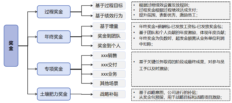 奖金激励的目标要结合业务、产品的价值链设计,强化“以客户为中心”的价值创造理念,充分激活组织、员工。 奖金生成基于增量绩效,从增长、增值、增效三个维度结合业务场景设计激励方向和生成方式,突破经营卡点。奖金分配基于价值创造、价值贡献,不同场景采用不同的分配方式。