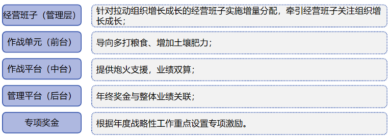 奖金的设计导向前中后台的利益联动牵引机制,明确责任定位,通过跨部门利益联动,业绩多算,利出一孔、力出一孔,牵引跨部门立体协同作战。