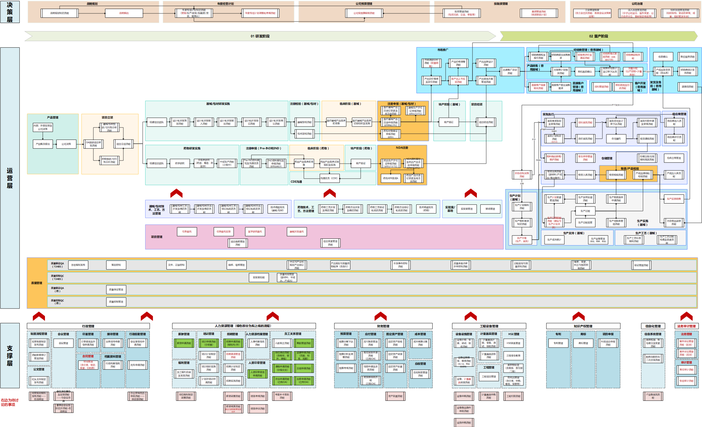 1.确定“3层2阶段”的流程框架。3层-战略层、运营层、支撑层;2阶段-研发阶段、量产阶段。下图为逻辑框架: