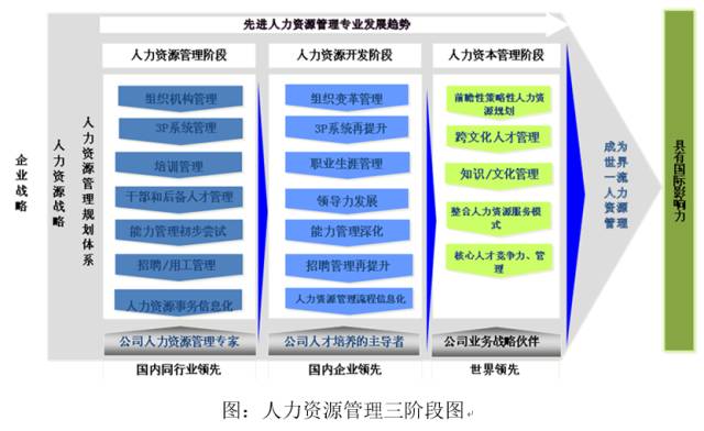 《企业人力资源管理三阶段模型》将企业的人力资源管理水平划分为为三个阶段,即:人力资源管理阶段、人力资源开发阶段和人力资本管理阶段,如下图所示: