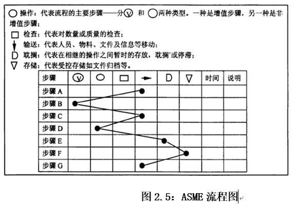 对于展示细节的低层流程图,一般选择在制造业应用较为广泛的标准ASME标准,即美国机械工程师学会(American Society of Mechanical Engineers)标准,这个标准已开始应用于办公室和服务环境下的流程描述。该方法有一个独特的优点,即:可以方便地评价流程的各个环节有否增值,其表现形式如图2.5所示: