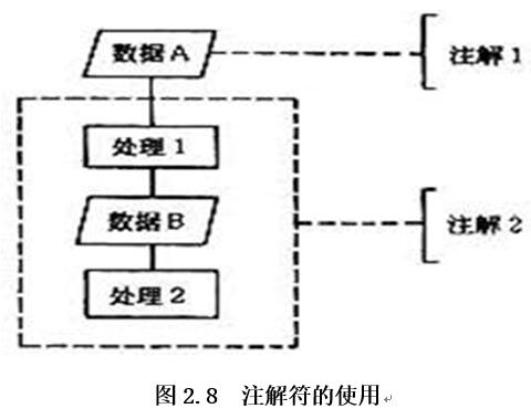 9.注解符:注解符由纵边线和虚线构成,用以标识注解的内容。虚线须连接到被注解的符号或符号组合上。注解的正文应靠近纵边线。请参看图2.8给出的注解符使用示例。