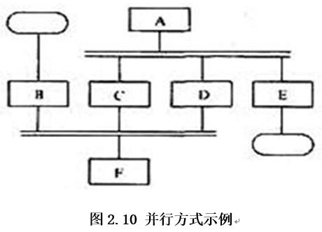 13.并行方式:一对平行线表示同步进行两个或两个以上并行方式的操作。并行方式的示例如图2.10,图中在处理A完成后才能进行处理C、D和E。同样,处理F要等处理B、C、D完成以后进行。但处理C可以在处理D开始和(或)结束前开始和(或)结束。
