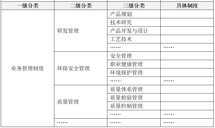 根据企业的业务主流程,将相似、相近、相关的经营管理活动进行归并,可以确定业务管理制度的分类。一般来说,业务管理制度包括业务拓展与营销管理、研发管理、生产管理(项目管理)、供应链管理、质量管理等若干二级制度模块,与企业业务主流程是相吻合的。