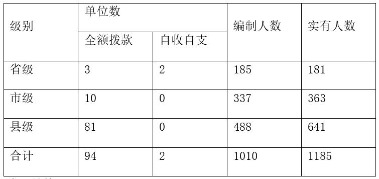 药监系统包含了省属、市属和县属事业单位。省属事业单位共有5个,从经费来源看,其中3个为全额拨款事业单位,2个为自收自支事业单位;市属事业单位10个,县属事业单位81个,全部为全额拨款事业单位。如表所示:
