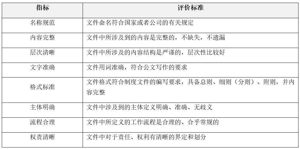 本方向的评估重点包括:制度体系文件的层次是否清晰;各项制度之间是否出现矛盾的情况,制度之间的配套性、关联度是否足够,接口是否清晰;整个制度体系是否缺少必要的程序性、支持性文件(如:作业标准、作业指导书、岗位操作手册,等等)。