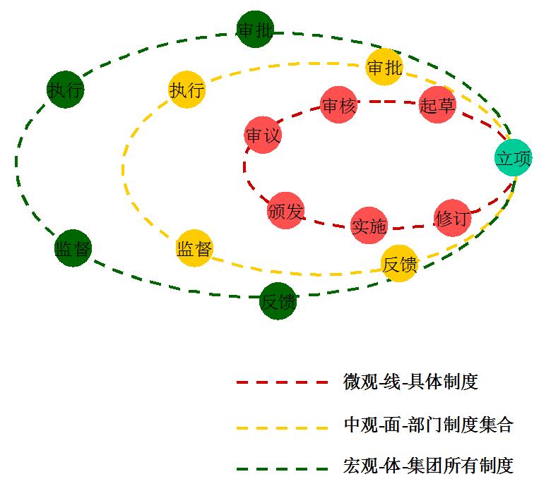 制度建设是一个复杂的系统工程,它由宏观、中观、微观三个循环体系构成(见图1),外部层次循环递进指导内部层次循环的建设方向,内部层次循环影响外部层次的执行效果。微观循环是单一制度的生命周期管理,指一个制度从立项、制定到废止的闭环管理过程;中观循环是各职能部门对相应制度集合的管理,体现具体部门职能面的工作;宏观循环是指企业作为一个整体,对其全部制度的运行管理。宏观循环指导中观循环的方向,中观循环确定微观循环的主体,各个循环由体到面、由面到条线、由条线到点,形成一个自我约束的管理体系。