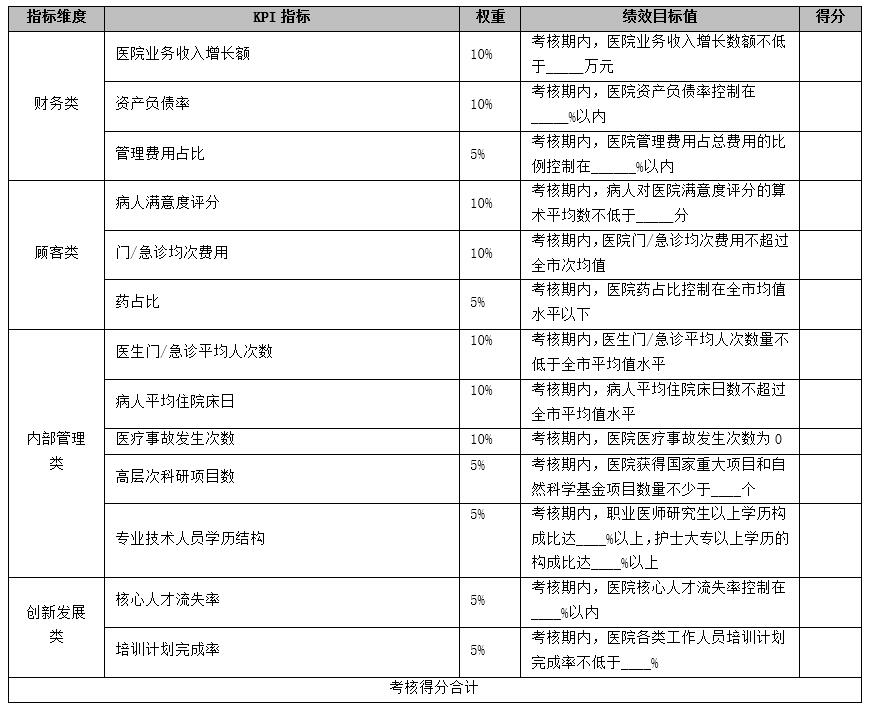 根据KPI指标以及岗位职责,形成了各个岗位的绩效考核指标,由于岗位众多,选取该医院院长的考核指标作为范例。