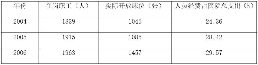 医院作为差额预算管理单位,虽有政府拨款,但其在医院收支中只占很小的比例,大部分支出经费仍需医院自行解决。随着在岗职工人数的不断增加,人员经费支出越来越多,在医院成本构成中的比例也逐年提高,如该院2004年在岗职工1839人,实际开放床位1045张,人员经费占医院总支出的24.36%;至2006年,在岗职工1963人,实际开放床位1457张,人员经费占医院总支出达29.57%。