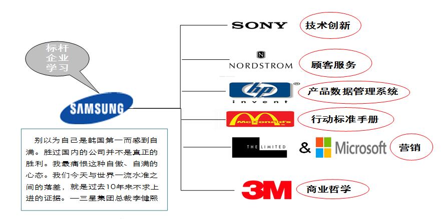 通过上述对标和寻找差距的过程,李健熙社长改变了过去三星傲慢自大的文化,俯身向世界知名企业学习,主动寻求改变,最终将三星带上世界级的品牌的顶峰。
