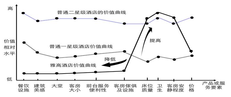 为了创造出这种“独特的价值”,雅高的专家们将酒店业的主要竞争“产业元素”全部列出来,比如“餐饮质量”、“建筑美感”、“大堂”、“客房大小”、“前台服务便利性”、“客房家具设施”、“床位质量”、“卫生”、“客房安静程度”,还有“价格”。它们把这些要素放在坐标横轴上,然后,根据它们对顾客的价值画出一条线,就是“价值曲线”,如下图所示: